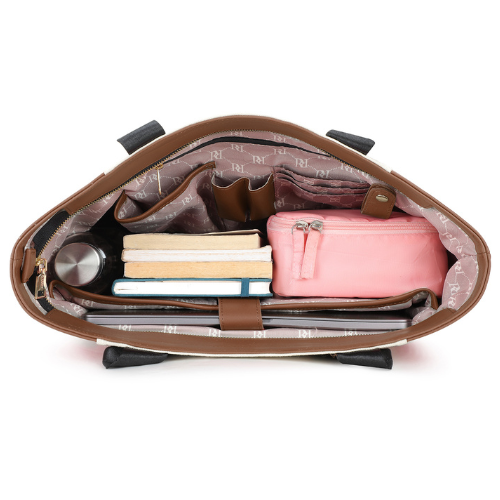 1 zipper pocket, 2 sew-in pockets, 1 key holder, 3 card slots and 2 pen holders.