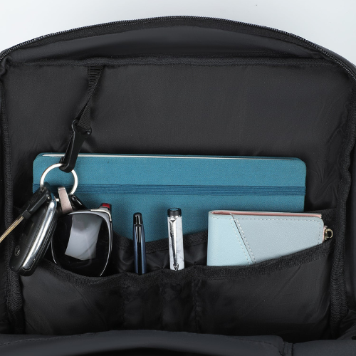 Zipped spacious front compartments. Designed for easy access and convenient storage of small accessories.